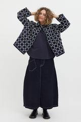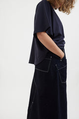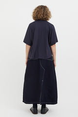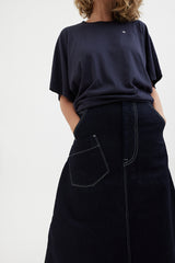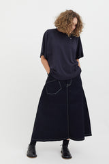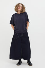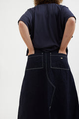 A timeless denim skirt by Minä Perhonen with a long A-line silhouette. Features a zip & button fly front, slanted side pockets and a feature patch pocket at the front, plus two patch pockets at the rear with a single Minä butterfly detail.