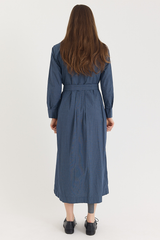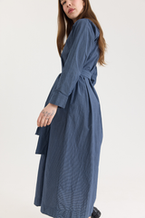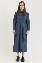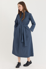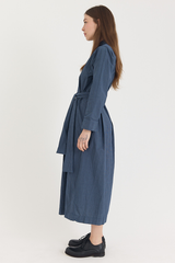 The Wedding Dress by Bergfabel is crafted from 100% cotton poplin with a naturally crinkled texture that lends structure to the classic silhouette. It features a traditional collar with a hidden button closure, side seam pockets, and an optional tie belt for ease of styling. The full pleated skirt and gathered waist add gentle volume, while the belt allows for subtle variations in shape—bringing a sense of playfulness to an otherwise timeless design.