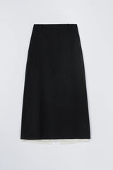 Crafted from anthracite tailoring fabric, this long skirt offers a structured yet relaxed silhouette. Lined with a white “unfinished” lining intentionally left visible at the hem and back slit, it adds a subtle, deconstructed detail. Features include belt loops, an elasticized back waistband, and a side zipper closure for a comfortable, tailored fit.