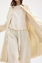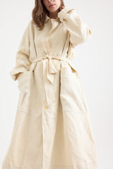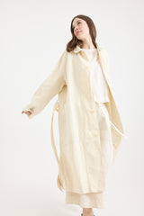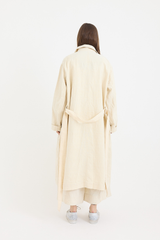 A midweight antic linen trench coat by Chez Vidalenc, featuring a rounded collar, button fastening, and a belt with loops for a tailored fit. Designed with two deep front pockets and two bust-level interior pockets for practicality. This timeless piece is a versatile addition to any wardrobe. Unlined.
