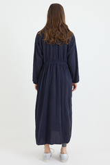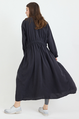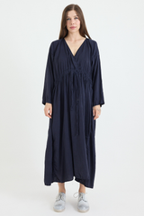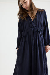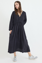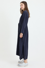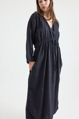 The K M Dress from Chez Vidalenc is crafted from smooth 100% silk and hand-dyed in-house. It features a V-neckline, long sleeves, stitched detailing on the cuffs, side pockets, and a full-length silhouette. An internal tie at the waist allows for easy adjustment.