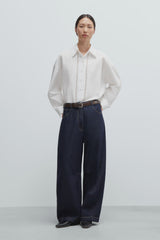 These curved baggy jeans feature a dark denim wash with contrasting stitching for a classic yet distinctive look. Designed with an oversized fit and low rise, they offer relaxed comfort and style. The traditional five-pocket design includes three front and two back pockets, complemented by belt loops for versatility. A unique internal knee seam adds subtle detail. Made from soft, substantial cotton fabric, these jeans provide ease of movement with a comfortable, non-rigid feel.