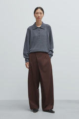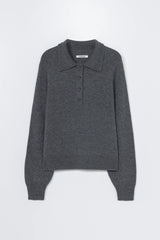 This staple oversized polo sweater is crafted from the softest Merino wool. It features a long-sleeve silhouette with a relaxed fit, a polo collar, and a four-button placket. Ribbed finishes at the cuffs, hem, and collar add subtle texture. A timeless essential designed for effortless layering.