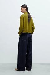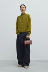 This Merino wool cardigan features a slightly oversized fit with a clean front button closure that extends to a high Perkins collar. Crafted in a soft, lightweight knit, it offers long raglan sleeves for a relaxed and easy silhouette. The woodbine green tone adds a flattering touch of color, making it a fresh and elevated everyday layer.