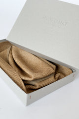 The Boxed Hat by Mature Ha is perfect for daily use, lightweight and easy to carry around. Designed to keep its shape in the box when not worn, reinventing the traditional straw hat that needs to be specially stored to keep it's shape. Made of soft material with folds that stretch and spring back, with a 7cm brim.