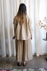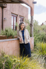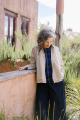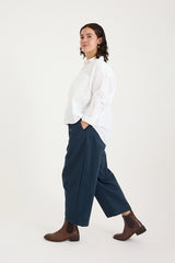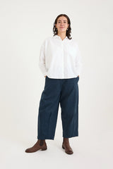 The Indra Shirt in Cotton Poplin is a boxy, a-line shaped shirt with a relaxed fit, featuring boxy style side paneling, cropped 3/4 length dolman sleeves, full button through front, curved hem and centre back pleat allow for an elegant drape.
