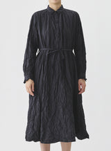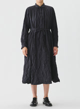 The Crinkled Cotton Stripe Dress is a mid-length style, made from a cotton-polyurethane blend that gives it a gorgeous crinkled texture. This dress features a classic collar, partial button up closure, and cuffed sleeves. It has an optional string at the waist that ties to cinch in the waist, or without it, it can be worn loose and boxy. It showcases a subtle tonal striped pattern all over, and ruched horizontal stitching adding to the overall texture.