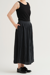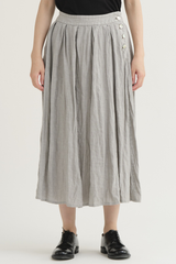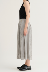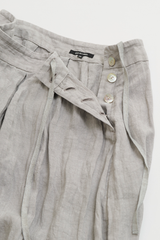 Designed in lightweight washed linen with a subtle crinkled effect, it features an A-line silhouette, a pleated waist, and adjustable interior drawstrings for a custom fit. Additional details include a clean waist, a single side seam pocket, and a nacre-hued button closure at the side. Unlined.