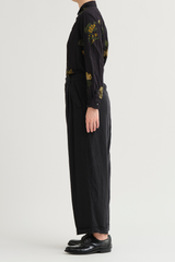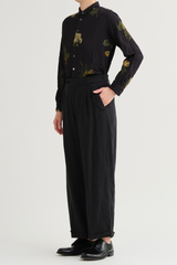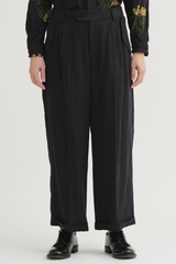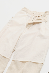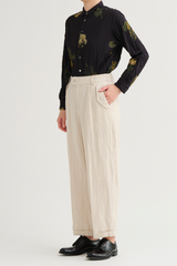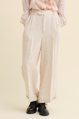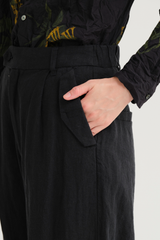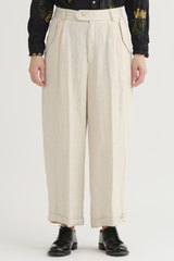 These pants from Pas de Calais are crafted from a lightweight linen and hemp blend, lined with cotton up to knee height. Designed for a relaxed fit, they feature a buttoned waistband with an elasticated back, two belt loops, a dropped crotch, and front flap pockets alongside back pockets. Finished with a cuffed hem, they offer the perfect balance of elegance and comfort.