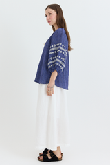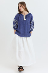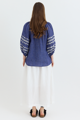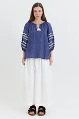 The Baleric Top is crafted from 100% linen and finished with delicate hand-stitched embroidery, showcasing the brand’s artisanal attention to detail. The top has exaggerated puff sleeves, and a tie up neckline that allows for versatility in styling. The lightweight linen and playful design makes this the perfect top for summer dressing.