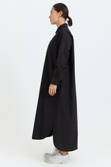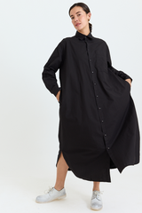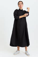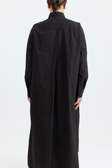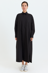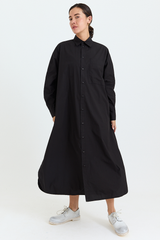 The Painter Dress from Toogood is an oversized shirt dress crafted from crisp cotton poplin with a soft washed finish. Falling to mid-calf, it features a relaxed silhouette with a sweeping curved hem that extends from front to back, making it ideal for layered looks. The design includes a sharp pointed collar, a button-down front, and a generously sized chest pocket.