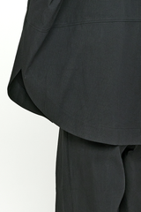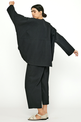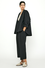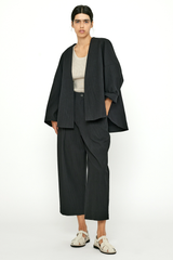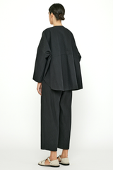 This open closure jacket with lantern sleeves is crafted from a midweight, structured, and tactile striped cotton fabric. It features an oversized fit, a curved hem, an elongated back, drop shoulders, paneled construction, and side seam pockets.