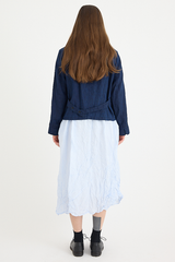 The Linen Indigo Chambray Jacket from Pas de Calais is crafted from a yarn dyed linen chambray fabric. This piece has a workwear inspired presence to it, with a delicate, French linen fabric that balances the style. The jacket features a coverall style collar, two front pockets and a back cinch for adjustable fit. This jacket is one that will gain more depth and character as it’s worn, aging beautifully with the wearer.