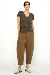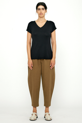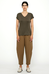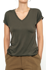 This tee from 7115 By Szeki is crafted from a lightweight, breathable Tencel-Spandex blend that delivers an ultra-soft, silk-like feel. It features a deep V-neck, cuffed short sleeves, and a relaxed, effortless fit that drapes elegantly—making it a timeless wardrobe essential.
