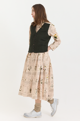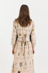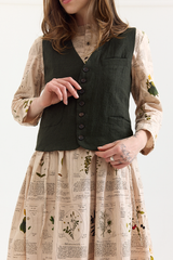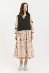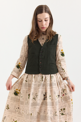 This timeless vest has a unique and moden take, made from half wool and half cotton with Manamis' lively garden-like print. It features a deep v-neckline, button up closure, 3 front pockets and a ribbon tie at the back to cinch in the waist depending on the desired fit.