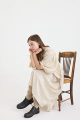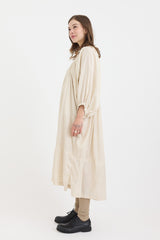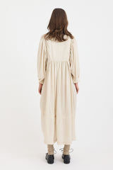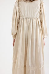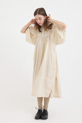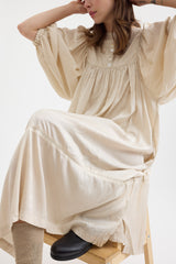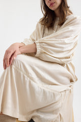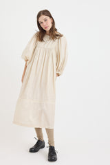 A silky soft dress with delicate gathers and billowy bishop sleeves. Features small side vents and pockets.