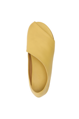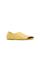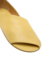 Smooth leather sandals with a unique form, marked by sinuous lines. The shape is supported by a hand coloured natural leather sole with recycled rubber insert on the heel.