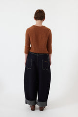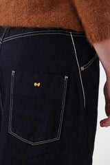 Denim jeans with a difference by Minä Perhonen. These are a wide leg take on the classic curve jeans. With a slightly rounded silhouette, these jeans are so comfortable and flattering. The jeans have a fly button front with the signature butterfly image stamped on the buttons, you can wear them rolled to show the Japanese selvedge. The inner lining has a mermaid scale pattern embroidered onto the fabric which adds a special touch and really makes this pair of jeans one of your forever pieces. Crafted of a blend of cotton and linen denim, this wide leg jean with classic 5-pocket styling sits on the natural waist. Features a dropped seam for a slouchy, baggier fit.
