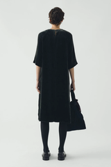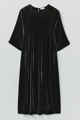 The Cocoon Silk Velvet Dress by TOAST is crafted from a silk-rich velvet that lends beautiful depth and natural lustre to the fabric. Cut to an easy, cocooning silhouette, it features elbow-length raglan sleeves and falls to a graceful lower-calf length. Lined for comfort and movement, the dress is finished with side seam pockets and a subtle back loop-and-button closure. A quietly elegant piece with a soft, fluid drape.