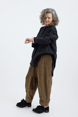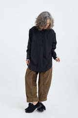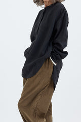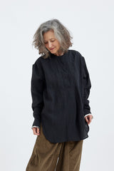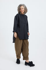 A collarless linen shirt with light gathers along the shoulders and rear yoke, full length sleeves with white trim and button up cuffs. A scallop hem, lengthened at the rear, is great for layering.