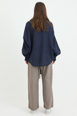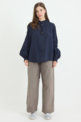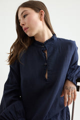 The Mini Medici Shirt by Chez Vidalenc is made from lightweight linen.. It features a frilled stand collar with a button keyhole closure, dropped shoulders, and long sleeves finished with delicate frilled cuffs. Designed for a relaxed fit, it also includes a curved hem with a slightly longer back, adding graceful movement to the silhouette.
