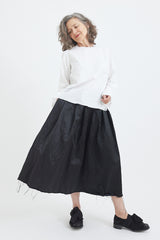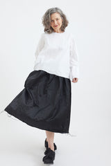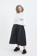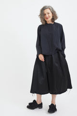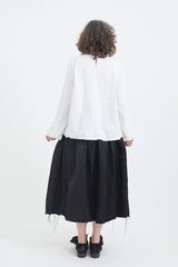 A light cotton top with a round neck, fastening at the rear with a single mother-of-pearl button. Features full length sleeves and raw hems.