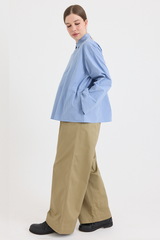 Cut from crisp cotton poplin, the Breton Blouse is defined by its boxy, structured silhouette. A classic collar sits above a concealed button placket with a single exposed button at the neckline, while side seam pockets add a utilitarian touch. Finished with an inverted box pleat at the back for subtle volume and movement.