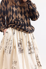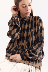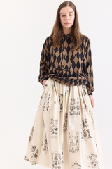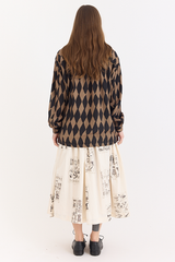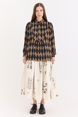 The Harlequin Shirt by Aleksandr Manamis is crafted from a midweight linen-cotton blend and features a classic two-tone harlequin pattern. It includes long cuffed sleeves, a front button fastening, a gathered front panel detail, and gathering at the back.