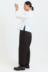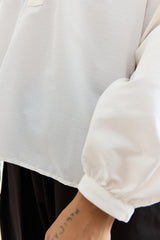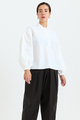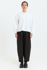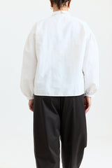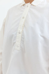 The Colina Shirt by Whiteread is crafted from lightweight ripstop nylon, renowned for its subtle checkered weave that adds durability while maintaining a soft, fluid drape. This relaxed yet refined piece features dropped shoulders, gathered sleeves, a small collar with a back slit, a three-button placket, and side splits at the hem.