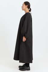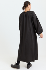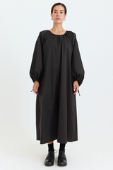 The Apolune Dress in Ebony by Whiteread is crafted from a lightweight cotton and elastane blend. Designed with a voluminous silhouette, it features long sleeves with adjustable gathered ties at the cuffs, a gathered neckline with a tie, and two side pockets. This contemporary piece reflects the brand’s signature aesthetic and is thoughtfully designed to be worn across all seasons.
