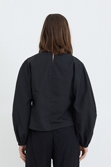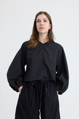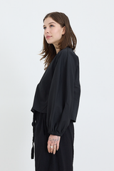 This long-sleeve shirt is crafted from a luxurious cotton-silk blend, offering an ultra-soft feel against the skin. It features a flattering V-neckline with a button closure at the back, elasticated sleeve hems, and a chic cropped waistline. Versatile enough to be dressed up or down for any occasion, this piece is a true wardrobe essential.