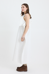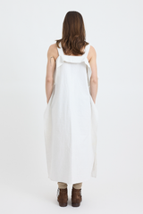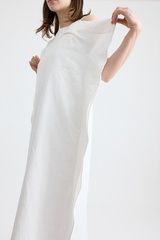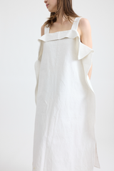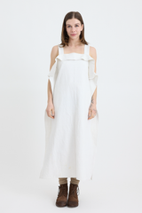 This dress is crafted from 100% repurposed linen, offering both sustainability and style. It features thick shoulder straps, two discreet side pockets, and a flattering maxi length with a relaxed, boxy fit. The dress is adorned with charming embroidered detailing on the chest, while extra fabric at the sides and top creates a ruffled effect, adding a touch of whimsy to this lovely piece.