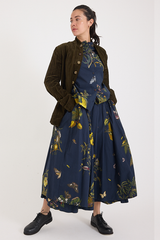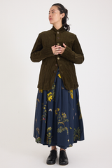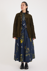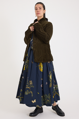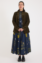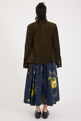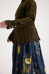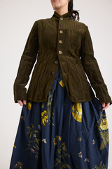 The Striped Velvet Jacket by Aleksandr Manamis is crafted from a unique cotton-and-metal blend, giving the velvet a crinkled texture while ensuring durability. Designed with a high lapel, various pockets, and a full lining, it balances an effortless look with sophistication. Mismatched vintage buttons add a distinctive finishing touch, reflecting Manamis’ signature aesthetic.