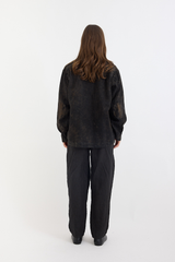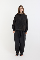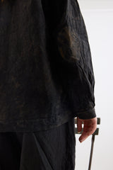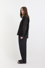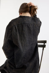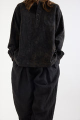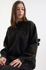 A classic Henley shirt crafted from midweight linen. It features a mandarin collar with four ceramic buttons, a single patch pocket on the left chest, and a rounded patch on the elbow. The full-length sleeves include single-button cuffs with gathered detailing at the center. A striking and contemporary piece.