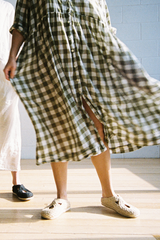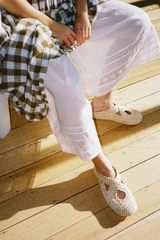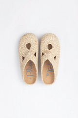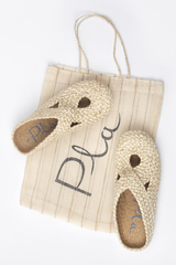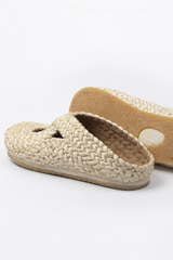 The Ikketes slide shoes feature a unique twist detailing at the front and are handmade from a single jute braid looped over a cotton lining. Its sole consists of two layers: one textile and the other natural crepe. The combination of jute and the sole ensures exceptional comfort with every step.