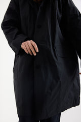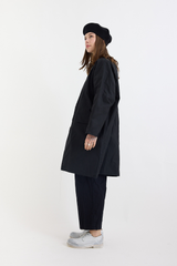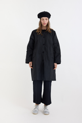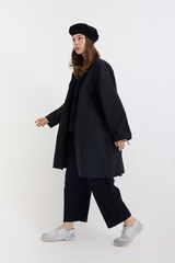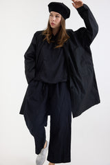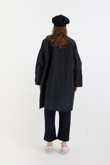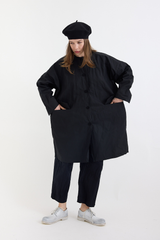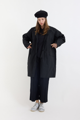 This coat by Scha is crafted from midweight 100% waxed cotton. It features two deep jetted flap pockets, raw edges, a collarless round neckline, felt button closures, dropped shoulders, and an oversized silhouette. A timeless piece full of personality.