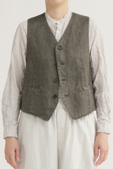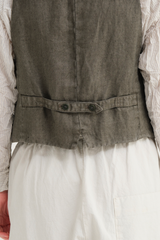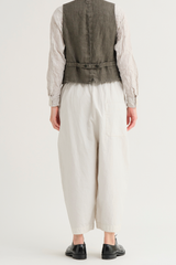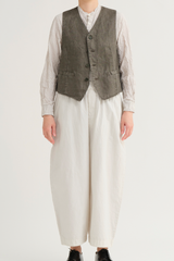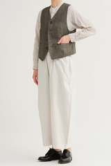 The Linen Twill V-Neck Vest from Pas de Calais is crafted from midweight linen with a cotton lining. It features a V-neck, a four-button closure, welt pockets at the front, and an adjustable back tab. Perfect for layering, it blends classic tailoring with a modern, feminine touch.