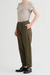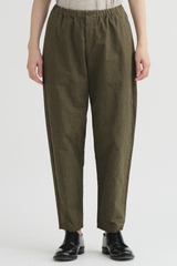 These pants from Pas de Calais are crafted from a midweight cotton and hemp blend with a subtly crisp texture. Designed for a sleek yet comfortable fit, they feature a slim, tapered cut, an elastic waistband, a buttoned fly closure, and two side seam pocket.