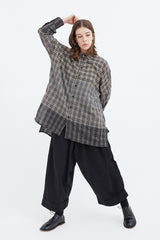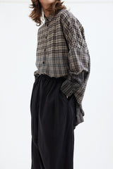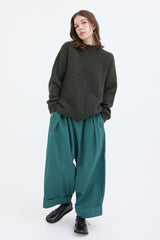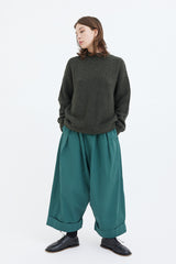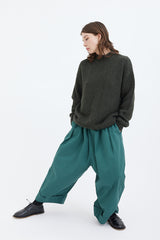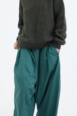 A voluminous trouser with front pleats, an elastic waistband, a patch back pocket and cropped, turned-up cuffs.